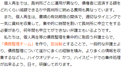 個人再生の相談では、弁護士が相談者の方のお話やご持参いただいた資料等をもとに、個人再生で問題が解決する見込みがあるか、個人再生を行った場合に毎月の返済額がどれくらいになるか等を検討いたします。