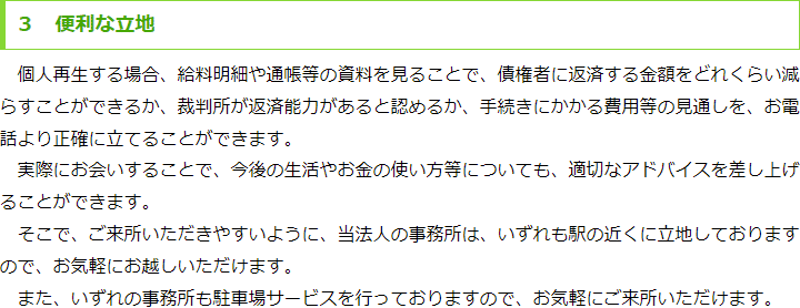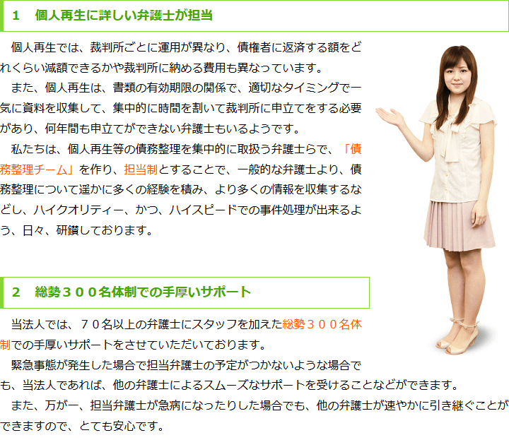 このチームの弁護士は、債務整理手続きに関する経験・知識が豊富にありますので、個人再生という専門性の高い手続きについても安心してお任せいただけるかと思います。